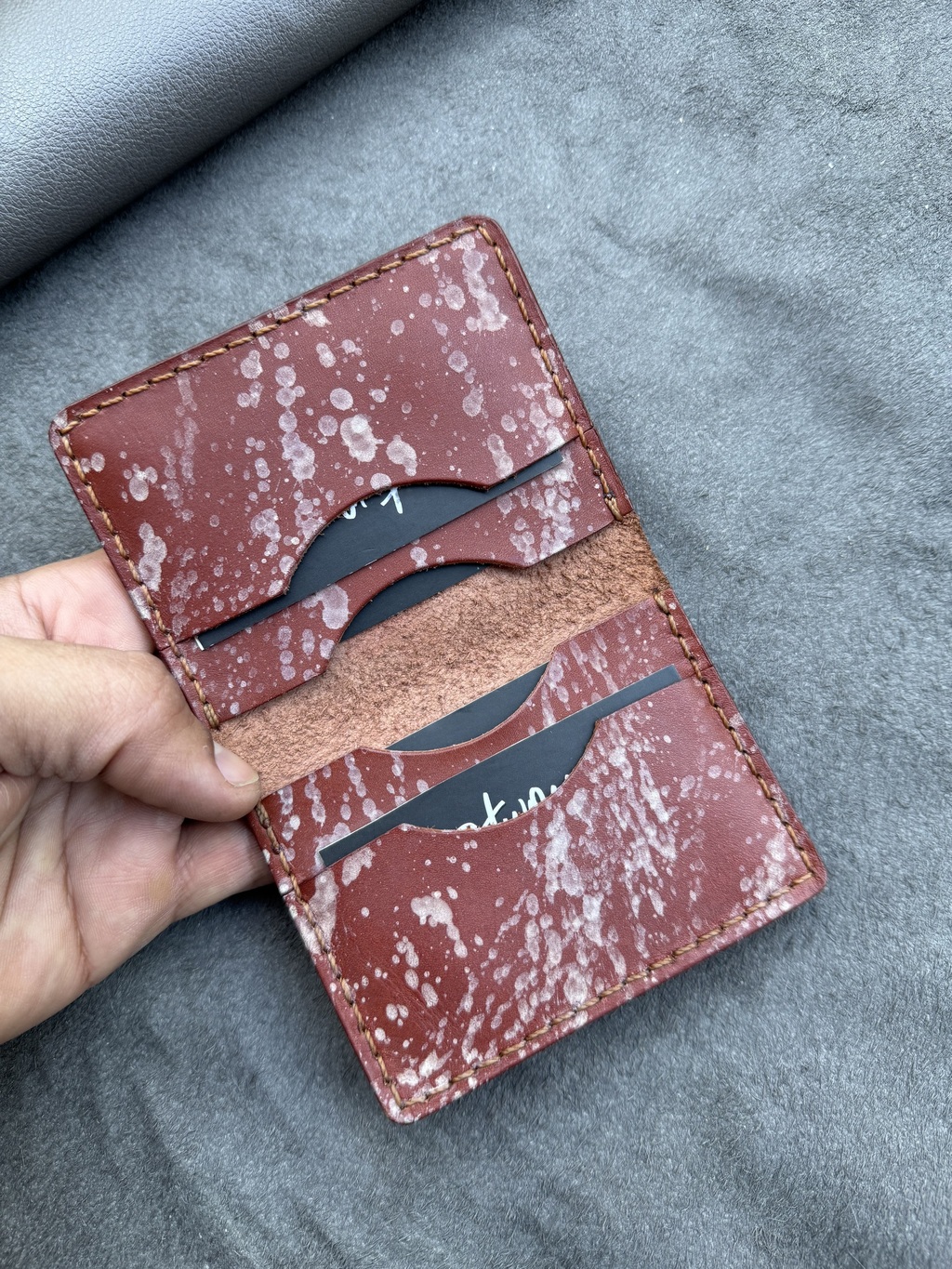 Carteira exclusiva feita à mão em couro bovino na cor pinhão, com 4 bolsos interior no mesmo couro, feito respingos com tinta branca em todo o couro