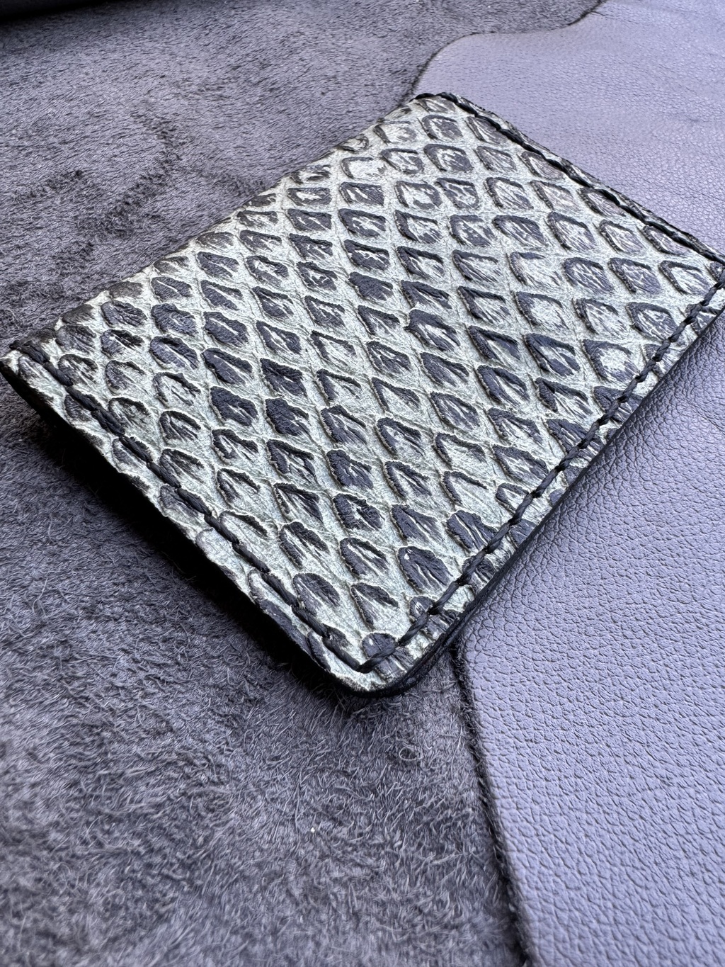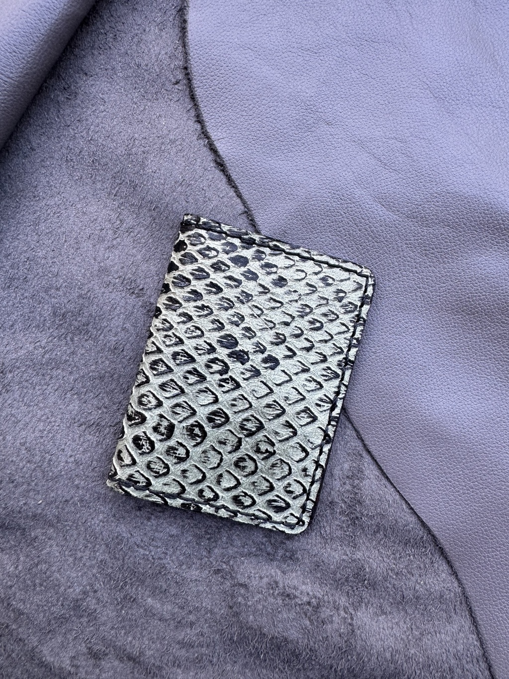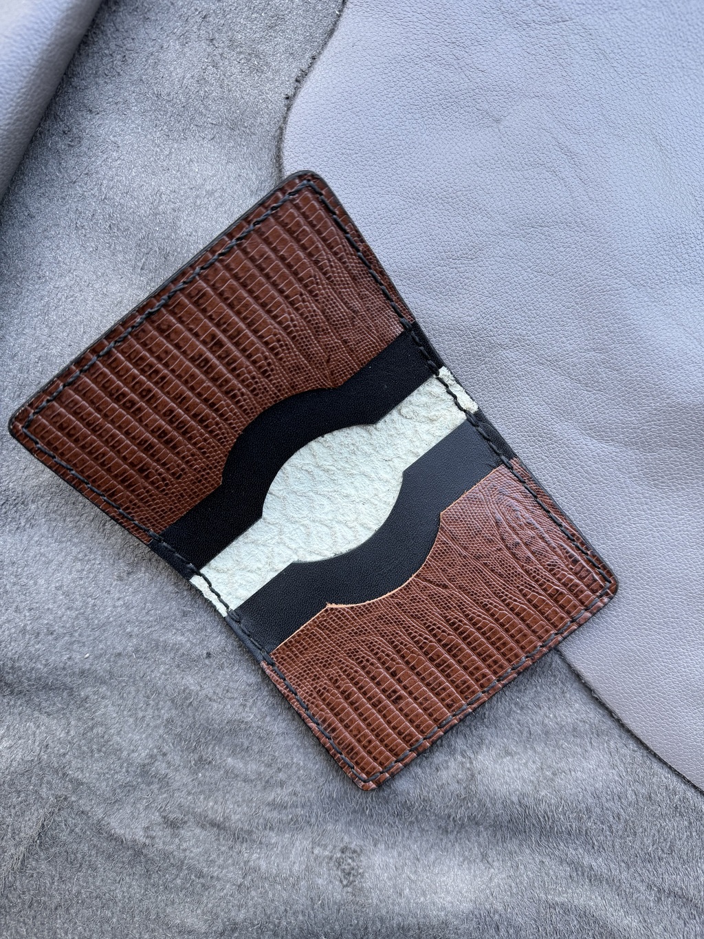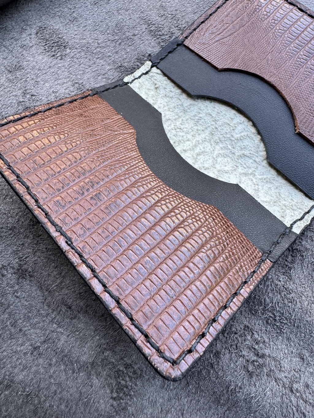 Carteira exclusiva feita à mão em couro bovino texturizado escamado, com bolsos interior em couro preto liso e bolsos externo caramelo com textura lizard.